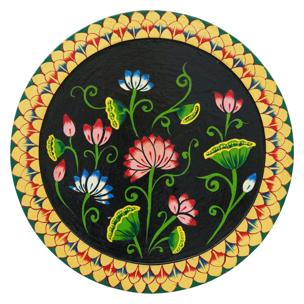 This hand-painted pichwai features a stunning floral design on a black background. The intricate details and vibrant colors make this piece a true work of art. Perfect for adding a touch of Indian culture to your home or as a unique gift.